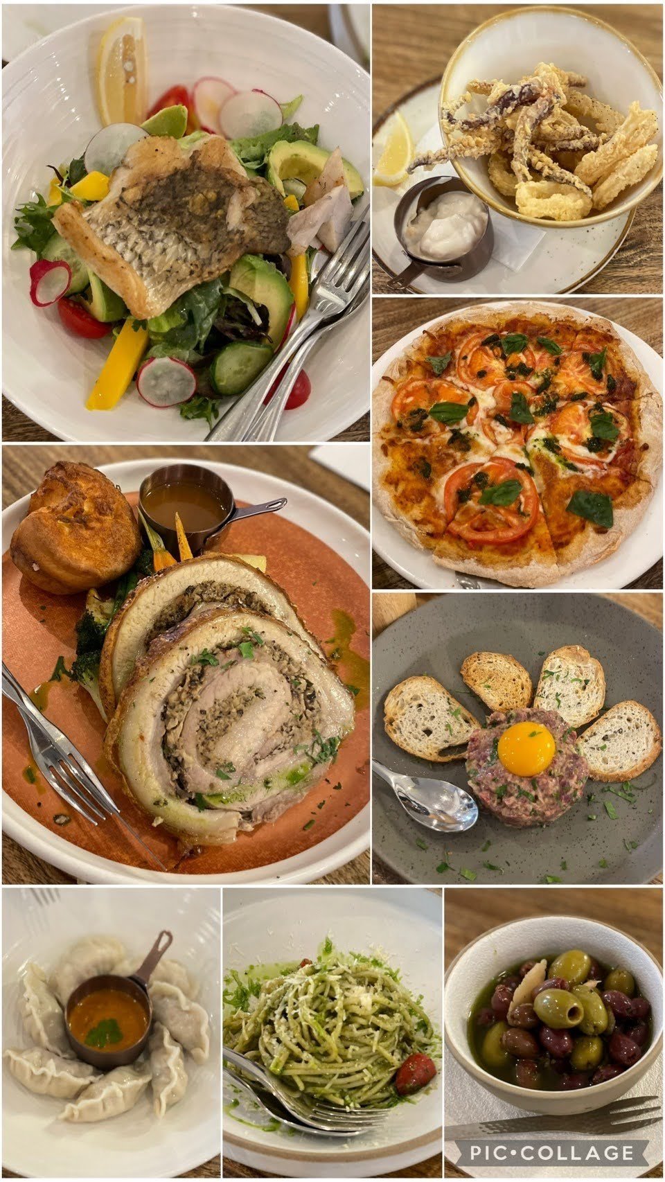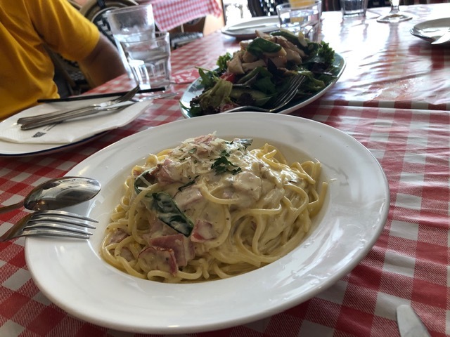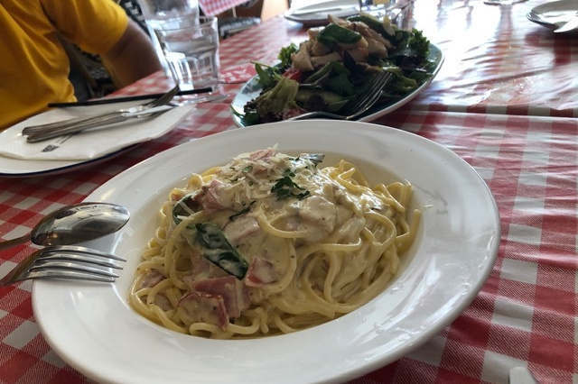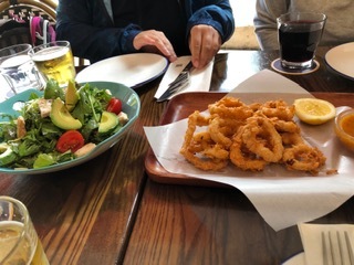 川島さん定番のカラマリと、チキンサラダ、ボロネーゼスパゲッティ、ペパロニスペシャルピザを注文し合計で$638。飲み物と合わせて合計$728でマイタン。