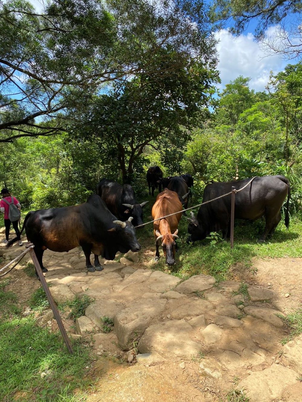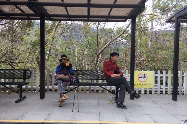 早速、ミニバス乗り場に移動し、9番バスに乗車、北潭涌のゲートで下車。雨が強く降ってきたので20分ほど、東屋で雨宿り、東屋の横の道をまっすぐに上がっていき、トイレの横を通って、郊遊径に入る、途中、の分かれ道を左に折れ、一路、漸竹湾方面へ、途中の小川の横で小休止。