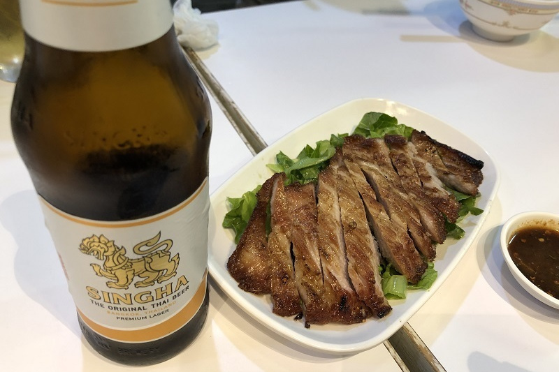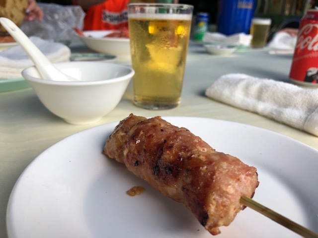 定番メニューだったもののいつもよりボリュームがあり、タイ料理屋で仕入れたソーセージとともに7人でビール飲んだ人$255、飲まない人$215にてマイタン