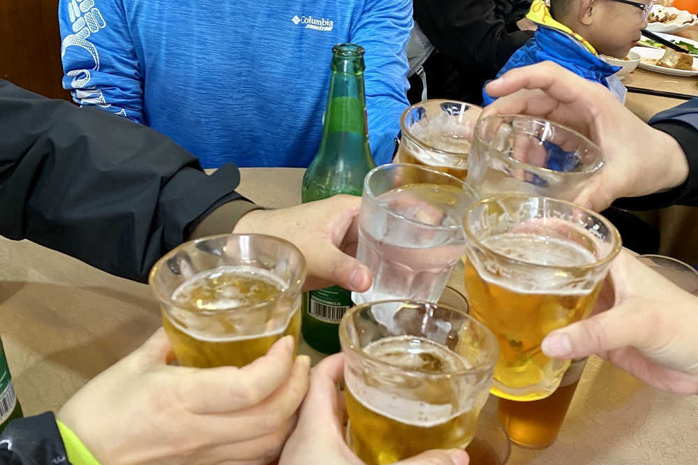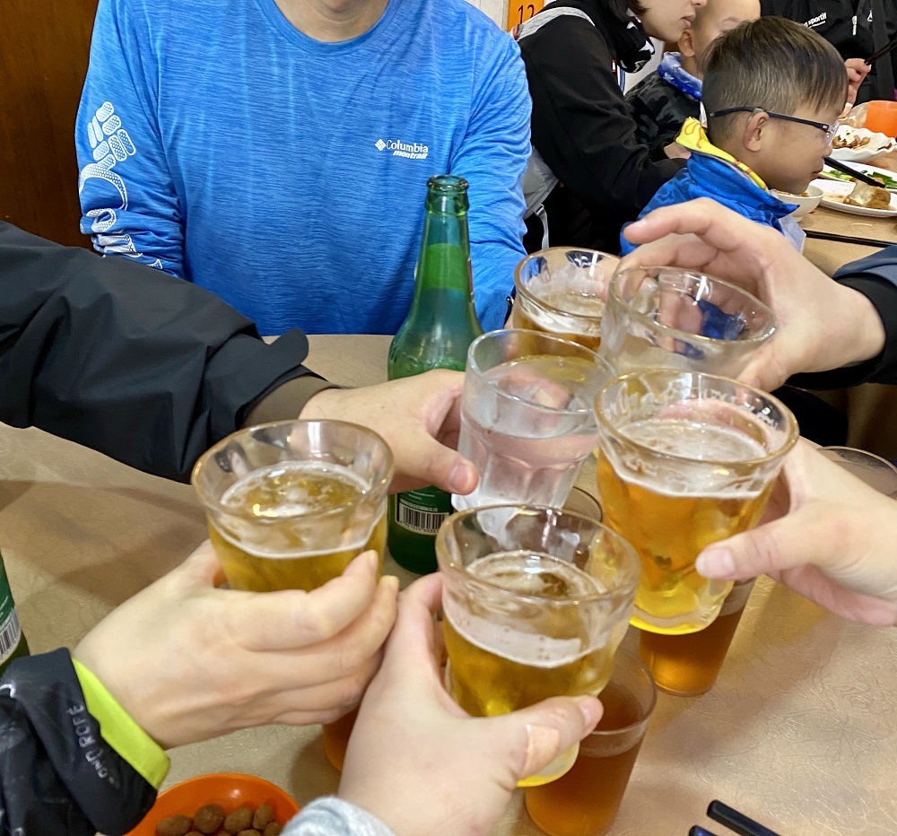 山海徑御用のいつものお店。一足先に下山した森田さんと、打ち上げ参加組の大八木さん黒宮さんが席を確保くださり、白ワインまで冷やしておいてくれたので着いたらすぐに宴会開始。