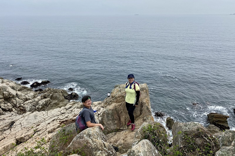 歩数を稼ぐ為、糧船灣碼頭の一つ手前の北丫碼頭で下船。佐藤さんは終点の糧船灣碼頭で下船し後ほど合流することに。北丫村はほぼ廃村となっているのか、いくつか廃墟や学校跡があり、20分ほどで糧船灣碼頭へ到着。碼頭にある海鮮レストランでは殻付きのウニを提供しており、ウニを頬張る人々で賑わっていました。暫く海岸沿いを進むと階段が現れ、少しずつ緩やかに白腊灣を見下ろす高度まで上ります。白腊村の辺りは開発して日が浅いのか施設や建物も比較的新しく、キャンプなどができそうな雰囲気です。白腊灣ではマリンスポーツも楽しめます。